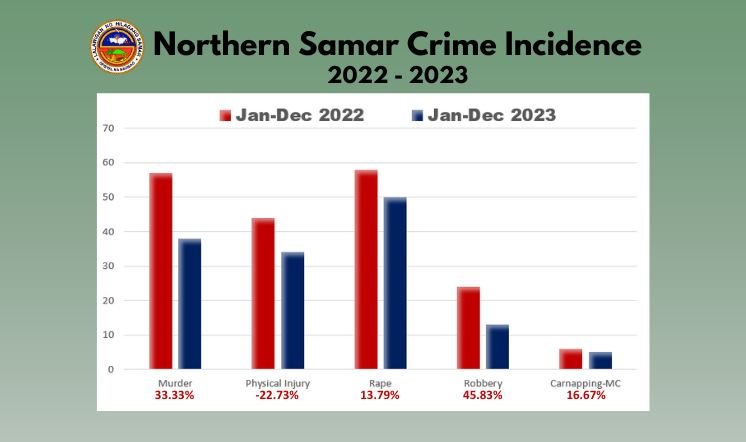 The Northern Samar Provincial Police Office (NSPPO) has reported a decline of crime incidents in the province during the 1st Quarter Provincial Peace and Order Council Meeting held on March 19, 2024 at the Ibabao Hall, Capitol Building. Police Colonel Sonnie B Omengan, NSPPO Provincial Director, presented that murder cases decreased from 57 in 2022 to 38 cases in 2023; physical injury cases from 44 in 2022 to 34 cases in 2023; rape cases from 58 in 2022 to 50 cases in 2023; and robbery cases from 24 in 2022 to 13 cases in 2023. Overall, crimes have reduced by 4.90% (a total of 70 incidents) from having 1,428 crimes in 2022 to 1,358 crimes in 2023. This shows that the province, with the collective efforts of the government, our law enforcers and the community, is gradually achieving a peaceful province. The Provincial Government and NSPPO have been forging partnerships with other security forces, law enforcement agencies, and LGUs in the province to promote peace and order, and reduce crime incidents to achieve a safer Northern Samar.