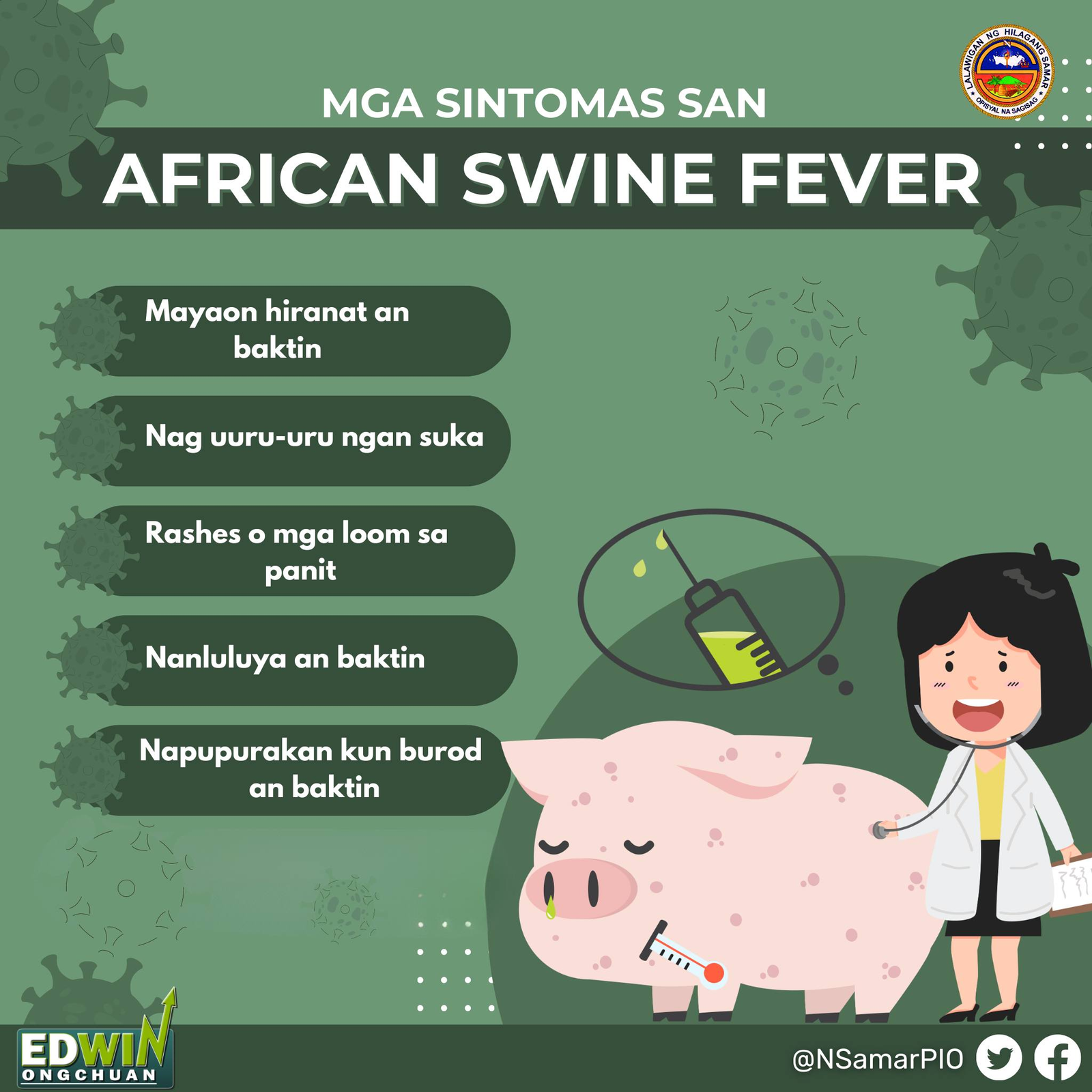 PUBLIC SERVICE ANNOUNCEMENT || Mga Sintomas san African Swine Fever Sayo san mga nagpapadayon nga risgo sa pag-ataman baktin an African Swine Fever. Kun sayo san mga sintomas san ASF makita sa baktin, igreport ini diretso sa iyo Municipal Veterinary Office basi maverify ngan mahimo an mga angay nga pitad agud mapudngan an paglarab sini continue reading : Mga Sintomas san African Swine Fever