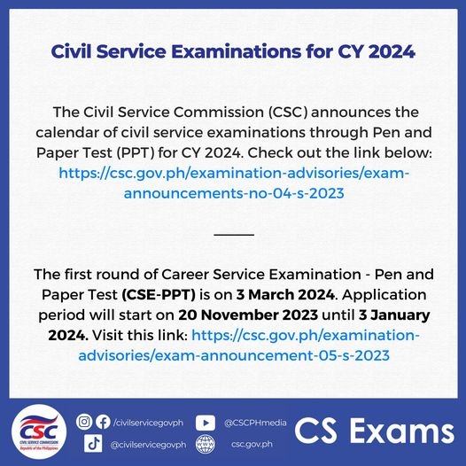 The Civil Service Commission (CSC) announces the calendar of civil service examinations through Pen and Paper Test (PPT) for CY 2024. Check out the link below: